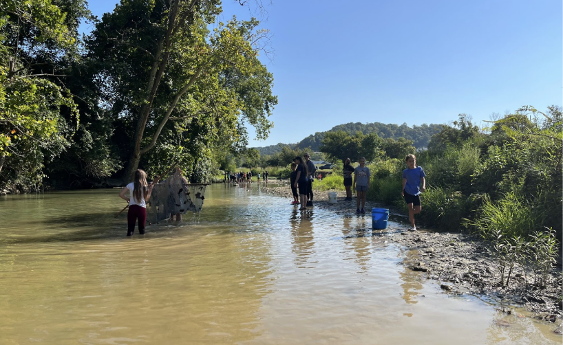 5th graders from Cline Elementary collect fish as part of a bioassessment during a River Explorer program in August 2025 on Banklick Creek, a tributary of the Licking River and Ohio River.